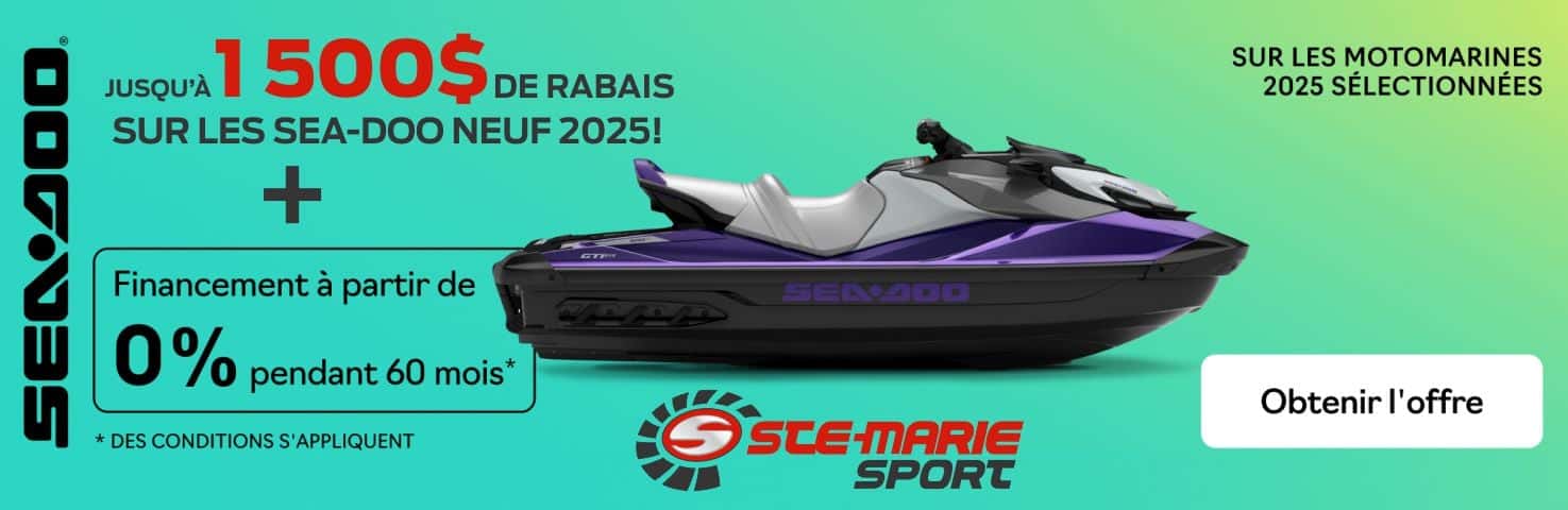 Bienvenue chez Ste-Marie Sport, concessionnaire de choix pour les produits récréatifs Bombardier: BRP (roadsters Spyder, Ryker, motomarines Sea-Doo, motoneiges Ski-Doo, VTT et VCC Can-Am),les motos, VTT et produits mécaniques Honda. Nous avons également un inventaire important de véhicules d'occasions certifiés et garanties, tels que Suzuki, Harley Davidson.