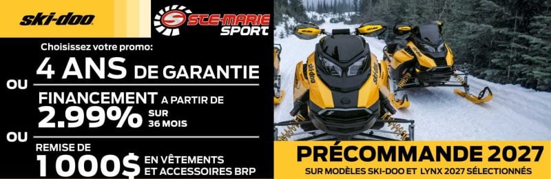 * Obtenez 4 ans de protection sur les modèles 2027 : Les véhicules admissibles sont les motoneiges Ski-Doo 2027 neuves et non utilisées. Les modèles jeunes, NEO et électriques sont exclus. Les consommateurs qui achètent un véhicule admissible bénéficieront d’une garantie limitée BRP de 12 mois plus 36 mois additionnels de protection B.E.S.T. Sous réserve des exclusions, limitations de responsabilité et de toutes autres conditions de la garantie limitée courante de BRP, y compris, mais sans s’y limiter l’exclusion de dommages causés par un usage abusif, une mauvaise utilisation ou de la négligence. La protection B.E.S.T. est assujettie à une franchise de 50 $ sur chaque réparation. Consultez votre concessionnaire BRP participant pour avoir tous les détails et pour recevoir une copie de la garantie limitée BRP et du contrat B.E.S.T. Jusqu’à épuisement des stocks. Cette offre ne peut être transférée, échangée, vendue ou combinée à toute autre offre à moins d’indication à cet effet dans le présent document. Consultez votre concessionnaire autorisé BRP pour plus de détails et vous informer sur la disponibilité des produits.
